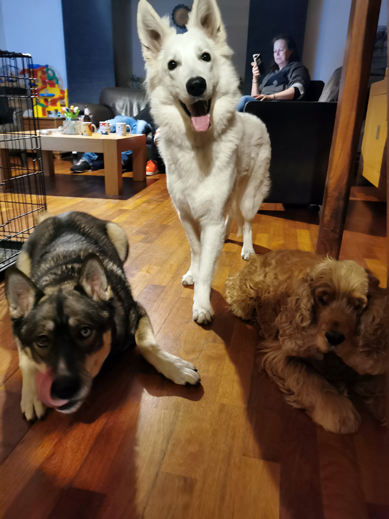 4 oktober was het natuurlijk Wereld Dierendag! Een speciale dag die veel baasjes niet zomaar voorbij laten gaan. De hondenschool doet dat ook niet en met het groepje dogdancers gingen we gezellig samen naar het bos. Coronaproof met niet teveel mensen en op voldoende afstand, maar wel heel gezellig. Het was een fijne wandeling in Vlodrop, een dorp vlak aan de Duitse grens. En na afloop kreeg ik een goodiebag met heerlijke snoepjes, Bonzo kluiven en een speelbal. Daarna gingen we nog mee naar een frituur om wat te drinken en vervolgens aten we bij opa en oma ons avondeten. Dat was een extra feestje. Doordat Molly last had van groeipijn ging ze niet mee naar het bos, maar thuis spelen kon wel, dus hebben we nog een hele tijd gespeeld. Vrouwtje deed nog een poging tot een gezellige dierendagfoto met mij en Mambo, maar dat werkte toch niet helemaal zoals ze wilde. Onze persoonlijkheden zijn er wel op te zien! Molly die nog lekker speels en eigenwijs is, Mambo die eigenlijk geen flauwbenul heeft van wat er te doen is en ik die mijn uiterste best doet om mezelf te beheersen. Je kunt wel stellen dat we een leuk trio zijn haha.