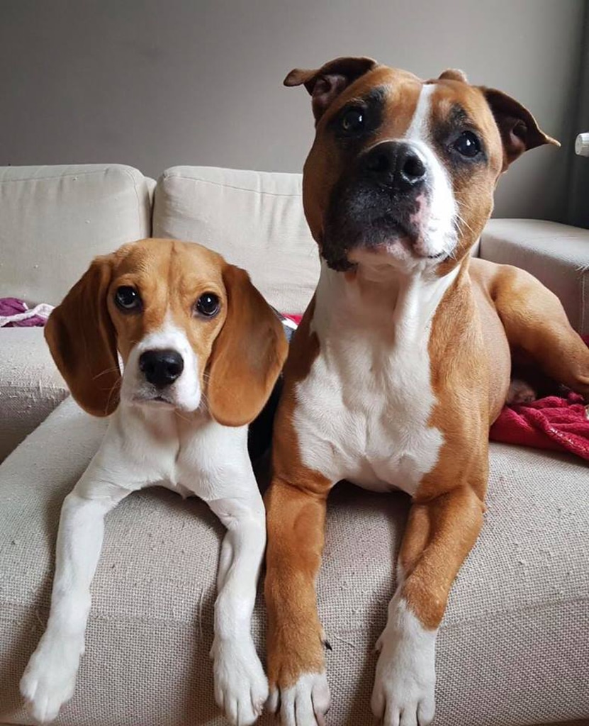 Hij is de beste vriendjes met Daisy de Beagle. Toen we Daisy de eerste dag hadden, was DJ bang voor haar. Hij liep snel van haar weg en zodra zij op de bank kwam, ging hij er snel vanaf. Al snel was dit gedrag voorbij en was hij aan haar gewend. Nu doen ze alles samen. Zo prachtig om te zien!!