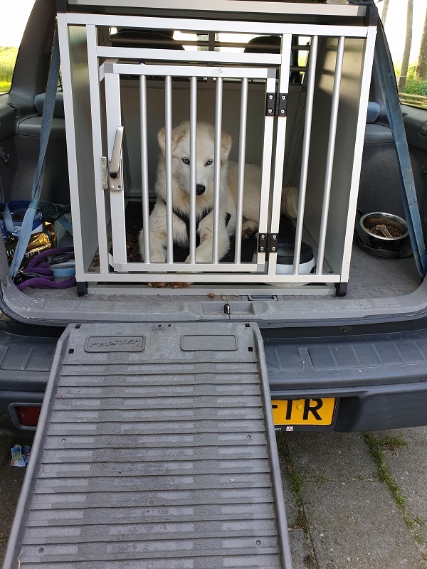 Natuurlijk wist ik al wel dat een hond in een autobench veel veiliger zit. Maar door altijd in busjes of bestelauto’s te rijden, hebben de honden hun eigen plaats achterin de bus of bestelauto. Dat ging altijd prima, hond er in gaat op de plaats liggen en op naar het bos. Hoewel ik moet toegeven dat het soms ook niet altijd heel handig is. Lola loopt bijvoorbeeld geregeld even naar voren omdat ze geaaid wil worden. Paika ging regelmatig op de voorstoel liggen in plaats van achterin op haar plaats te blijven.