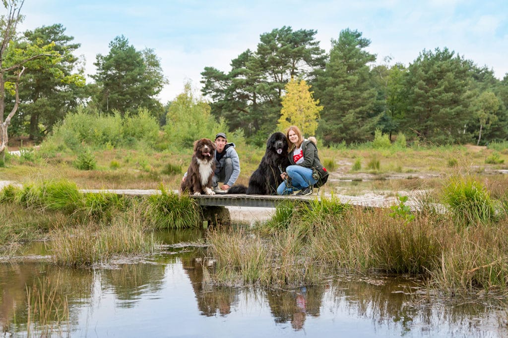 Op de terugweg moesten we met een bruggetje over een grote plas water. Ja, de plas waar Fender in wilde duiken in het begin! De locatie daar is supermooi, dus besloten we ook hier nog toch foto te maken. Dat was wel even spannend! Ik zag het namelijk al gebeuren dat de jongens zo het water in zouden springen en mijn vriend en ik er achteraan zouden moeten. Gelukkig bleven ze netjes zitten, al was de verleiding van hun koppies af te lezen.