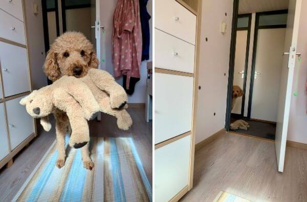Als ze eenmaal ‘droog’ zijn, weet ik niet hoe snel ik ze er vanaf wil halen.. ‘baasje, help me alsjeblieft’, ik bespring ze enthousiast en ‘was’ ze zelf met mijn bekkie nog even helemaal na. ‘Kom maar lieve knuffies.. ik zorg voor jullie! Jullie ruiken snel weer lekker vertrouwd naar mijn eigen poedelgeur!’
