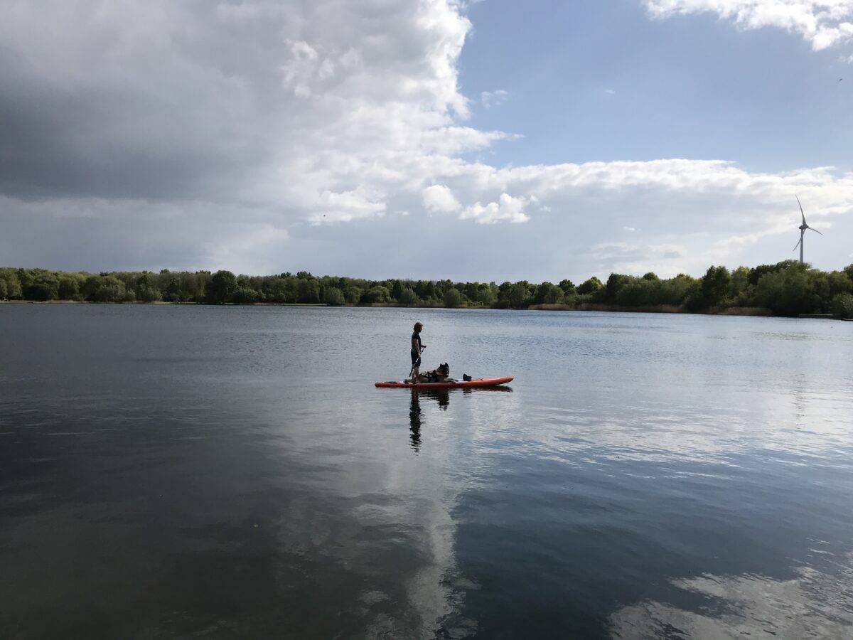 Daar gingen we dan. Samen met de baas, bazin en een vriendin/collega van de bazin gingen we naar de plas achter ons huis. De baas moest eerst de SUP op pompen. Dat is dan wel weer handig. Die dingen kan je op pompen en leeg laten lopen. Want, 2 van die units van 12 voet in huis, is niet heel praktisch.