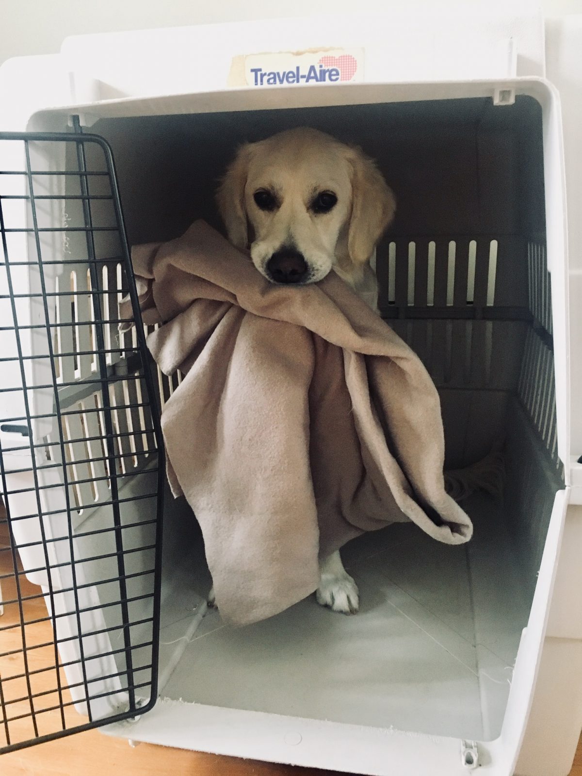 Een week later kwam mijn baasje ineens thuis met een grote plastic ‘kist’ met tralies. (reisbench)