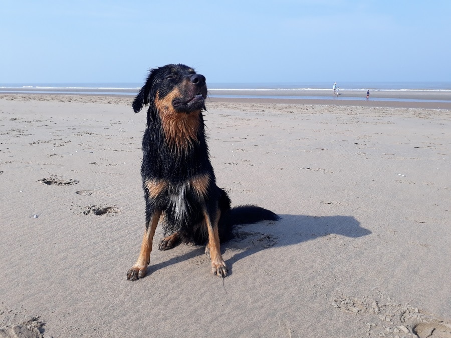 Nu was dat anders! De zee, de andere honden… Sennah was zo druk met alles om hem heen dat hij zo achter de andere honden aan het water in ging en er van top tot teen nat er weer uit kwam! Hij vond het fantastisch!